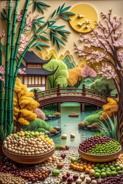 这幅画描绘了一个宁静而多彩的场景,结合了自然和艺术的元素。在前景中,有各种各样的水果和坚果排列在碗里,散落在地上。这些水果包括圆形、椭圆形和细长的水果,以及棕色、绿色和黄色等不同颜色的坚果。水果和坚果被放置在鹅卵石或小石头的床上,创造一个自然的环境。中间有一个宁静的池塘,湖水清澈,倒映着周围的景色。池塘周围是郁郁葱葱的绿色植物,包括竹子和开花树木。竹子高大而充满活力,叶子深浅不一,有些带点粉红色。开花的树木有粉红色和白色的花朵,为景色增添了一抹色彩。背景是一座木桥,上面有复杂的雕刻,横跨池塘。桥的周围有更多的绿色植物,包括茂密的灌木和树木。天空是温暖的金色色调,暗示着日出或日落,一个巨大的黄色太阳部分被云遮住了。总体而言,图像将自然元素与艺术细节相结合,创造了一个和谐而富有视觉吸引力的场景。,这幅画描绘了一个用各种材料制作的宁静的风景场景,创造了剪纸艺术的效果。它的特点是一条河从中心流过,上面漂浮着小船。河岸上点缀着五颜六色的秋色树木,包括黄色、橙色和绿色。在左岸,有一座传统的亚洲风格的房子,在右岸,可以看到一座类似的房子。背景展示了具有分层纹理的风格化山脉,从绿色到棕色,以及明亮的黄色太阳和飞鸟。前景充满了各种各样的彩色圆形物体,类似糖果或弹珠,为场景增添了有趣的元素。这幅画描绘了一个宁静而多彩的场景,结合了自然和艺术的元素。在前景中,有各种各样的水果和坚果排列在碗里,散落在地上。这些水果包括圆形、椭圆形和细长的水果,以及棕色、绿色和黄色等不同颜色的坚果。水果和坚果被放置在鹅卵石或小石头的床上,创造一个自然的环境。中间有一个宁静的池塘,湖水清澈,倒映着周围的景色。池塘周围是郁郁葱葱的绿色植物,包括竹子和开花树木。竹子高大而充满活力,叶子深浅不一,有些带点粉红色。开花的树木有粉红色和白色的花朵,为景色增添了一抹色彩。背景是一座木桥,上面有复杂的雕刻,横跨池塘。桥的周围有更多的绿色植物,包括茂密的灌木和树木。天空是温暖的金色色调,暗示着日出或日落,一个巨大的黄色太阳部分被云遮住了。总体而言,图像将自然元素与艺术细节相结合,创造了一个和谐而富有视觉吸引力的场景。。,五谷坚果创意画