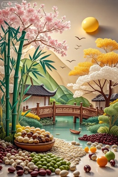 这幅画描绘了一个宁静而多彩的场景,结合了自然和艺术的元素。在前景中,有各种各样的水果和坚果排列在碗里,散落在地上。这些水果包括圆形、椭圆形和细长的水果,以及棕色、绿色和黄色等不同颜色的坚果。水果和坚果被放置在鹅卵石或小石头的床上,创造一个自然的环境。中间有一个宁静的池塘,湖水清澈,倒映着周围的景色。池塘周围是郁郁葱葱的绿色植物,包括竹子和开花树木。竹子高大而充满活力,叶子深浅不一,有些带点粉红色。开花的树木有粉红色和白色的花朵,为景色增添了一抹色彩。背景是一座木桥,上面有复杂的雕刻,横跨池塘。桥的周围有更多的绿色植物,包括茂密的灌木和树木。天空是温暖的金色色调,暗示着日出或日落,一个巨大的黄色太阳部分被云遮住了。总体而言,图像将自然元素与艺术细节相结合,创造了一个和谐而富有视觉吸引力的场景。,这幅画描绘了一个用各种材料制作的宁静的风景场景,创造了剪纸艺术的效果。它的特点是一条河从中心流过,上面漂浮着小船。河岸上点缀着五颜六色的秋色树木,包括黄色、橙色和绿色。在左岸,有一座传统的亚洲风格的房子,在右岸,可以看到一座类似的房子。背景展示了具有分层纹理的风格化山脉,从绿色到棕色,以及明亮的黄色太阳和飞鸟。前景充满了各种各样的彩色圆形物体,类似糖果或弹珠,为场景增添了有趣的元素。这幅画描绘了一个宁静而多彩的场景,结合了自然和艺术的元素。在前景中,有各种各样的水果和坚果排列在碗里,散落在地上。这些水果包括圆形、椭圆形和细长的水果,以及棕色、绿色和黄色等不同颜色的坚果。水果和坚果被放置在鹅卵石或小石头的床上,创造一个自然的环境。中间有一个宁静的池塘,湖水清澈,倒映着周围的景色。池塘周围是郁郁葱葱的绿色植物,包括竹子和开花树木。竹子高大而充满活力,叶子深浅不一,有些带点粉红色。开花的树木有粉红色和白色的花朵,为景色增添了一抹色彩。背景是一座木桥,上面有复杂的雕刻,横跨池塘。桥的周围有更多的绿色植物,包括茂密的灌木和树木。天空是温暖的金色色调,暗示着日出或日落,一个巨大的黄色太阳部分被云遮住了。总体而言,图像将自然元素与艺术细节相结合,创造了一个和谐而富有视觉吸引力的场景。。,五谷坚果创意画,水晶工艺