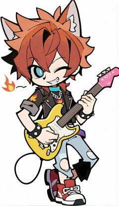 QBJS,Q-version character,1boy,solo,red hair,white background,no socks,one eye closed in a playful way,high-top sneakers,spiky hair,chibi,leather jacket,wolf ears,mischievous grin,short sleeves,full body,spiky bangs,flame (symbol),chain necklace,red sneakers,ripped jeans,simple edgy look,plain white,holding a guitar,looking at viewer,studded bracelet,black t-shirt,jacket open,chibi,<lora:lora:1>,