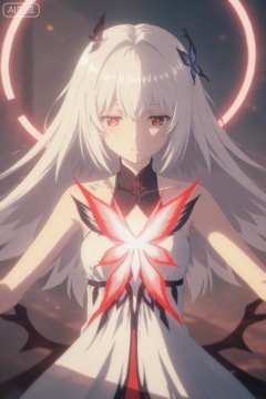 khaos lv.2,1girl, long hair,red eyes, dress, white hair, gradient, halo,,smooth anime-style texture, soft sunlight through window, depth of field, cinematic lighting, anime style, detailed eyes reflection, soft shadows,shallow focus,anime screencap,anime coloring,hair ornament