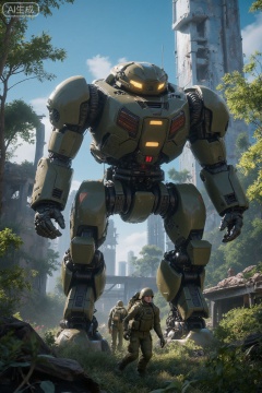 A highly detailed CGI scene set in a futuristic, post-apocalyptic environment. The foreground features a massive, olive-green mechanized war robot, towering with a menacing presence. Its bulky design includes a large domed head with red and yellow lights and a prominent angular chest plate. Limbs are thick and articulated, showing hydraulic and electrical components.
