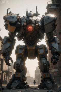 . This is a highly detailed CGI rendering of a massive, futuristic, mechanized war robot standing in an urban setting. The robot, resembling a **** with humanoid features, dominates the foreground. It has a bulky, metallic frame with a mix of black, grey, and orange segments, giving it a menacing appearance. Its head is equipped with a large, rectangular red light, possibly a targeting system, and numerous sensors and antennas protrude from various points. The torso features a complex array of mechanical components, including large, cylindrical barrels and a central, glowing red panel that could be a power source. The legs are thick and sturdy, with articulated joints and hydraulic pistons, allowing for mobility.