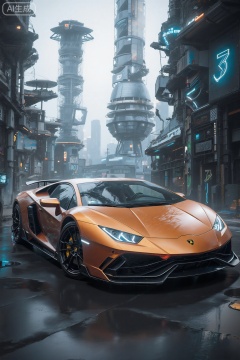 The background showcases a dense, futuristic cityscape with towering, cylindrical skyscrapers in the distance, their silhouettes blurred by the misty, foggy atmosphere. The city's architecture is a blend of modern and industrial styles, with metallic, angular structures and numerous neon signs, including a prominent "3" sign in the upper right corner. The ground is a wet, reflective surface, suggesting recent rainfall, with puddles and wet patches adding a sense of depth and realism. The overall color palette is dominated by cool tones, with the car's metallic orange contrasting sharply against the muted grays and blacks of the urban environment. The image is rich in detail, capturing the essence of a high-tech, futuristic world.