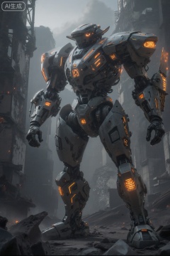 . This is a highly detailed CGI (computer-generated imagery) rendering depicting a futuristic, mechanized humanoid robot standing in a post-apocalyptic urban environment. The robot, constructed with a metallic exoskeleton, exhibits advanced engineering with intricate, glowing orange circuitry and mechanical components. Its body is bulky and robust, with a domed head featuring a prominent, glowing red eye. The torso is adorned with angular, segmented armor, and its limbs are equipped with powerful, articulated joints. The right arm is raised, holding a large, glowing sword-like weapon, while the left arm is bent at the elbow, showcasing a complex, mechanical structure.