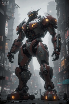 . This is a highly detailed CGI rendering of a futuristic, humanoid robot standing in a bustling urban environment. The robot, resembling a cyborg, is massive and imposing, with a complex, mechanized design. Its body is predominantly metallic, featuring a mix of dark grey and red hues with intricate, glowing orange accents. The head is equipped with a visor-like face shield, giving it a menacing, robotic appearance. The shoulders and arms are adorned with sharp, angular protrusions, while the torso and legs are armored with thick, segmented plates. The lower body is particularly robust, with large, powerful legs and feet that resemble mechanical pistons. The background showcases a dense, futuristic cityscape with towering skyscrapers and a cloudy sky, suggesting a dystopian or post-apocalyptic setting. The cityscape is filled with neon signs, including one that reads "LO," adding to the futuristic ambiance. The overall scene is dynamic, with the robot standing confidently in the foreground, dwarfing the surrounding buildings. The image captures a blend of science fiction and cyberpunk aesthetics, emphasizing the robot's formidable presence and the dystopian urban environment it dominates.