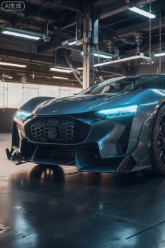 The background showcases an expansive, high-tech workshop, characterized by metallic structures, large windows, and a mix of warm and cool lighting. The ceiling is adorned with industrial lighting fixtures, casting a soft glow that highlights the car's sleek curves and metallic sheen. The floor is composed of polished, dark tiles, reflecting the car and adding a sense depth and realism. The overall ambiance is one of cutting-edge engineering and technological prowess, with the car serving as the centerpiece, embodying the pinnacle of automotive design and performance.