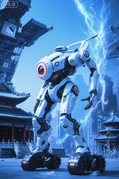 The background showcases a bustling cityscape with a mix of modern and traditional architecture. To the left, there is a large, angular, metallic structure with a blue hue, possibly a spaceport or a futuristic transportation hub. In the foreground, a traditional Chinese-style building with a curved roof and ornate details stands prominently, adding a cultural contrast to the futuristic setting. The sky is a gradient of deep blue, with ethereal, glowing blue and white energy beams emanating from the robot's right side, suggesting a powerful, possibly technological or supernatural source. The overall scene exudes a blend of advanced technology and cultural heritage, creating a visually striking and immersive experience.