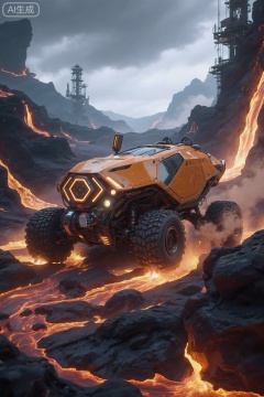 . This is a highly detailed, CGI-rendered digital artwork depicting a futuristic, orange-colored, off-road vehicle navigating through a volcanic landscape. The vehicle, resembling a rugged, all-terrain rover, features a hexagonal pattern on its front and sides, with large, rugged tires and a prominent, cylindrical exhaust system. Its body is adorned with various mechanical details, including vents and sensors, giving it a robust and futuristic appearance. The background showcases a dramatic volcanic environment with molten lava flowing down rocky slopes, creating vivid, fiery red and orange hues that contrast starkly with the cooler blue and grey tones of the rocky terrain. In the distance, there are towering, jagged mountains and industrial structures, some partially obscured by smoke and ash, suggesting a post-apocalyptic or sci-fi setting. The sky is overcast with dark clouds, adding to the ominous atmosphere. The overall scene is rich in texture and depth, with a high level of realism achieved through meticulous attention to detail and lighting effects.