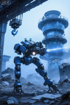 in a digital artwork. This is a highly detailed, CGI-rendered scene set in a post-apocalyptic industrial landscape. The central figure is a large, blue, mechanized war robot, resembling a bipedal ****, with a menacing, aggressive stance. It is equipped with a powerful, mounted machine gun, emitting a bright, blue beam of light, and a large cannon on its back. The robot's metallic surface is polished, reflecting the surrounding environment, and its joints are articulated with hydraulic precision.