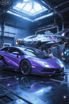 . This is a highly detailed CGI (computer-generated imagery) rendering depicting a futuristic, high-tech laboratory setting. The scene features two prominent objects: a sleek, purple Lamborghini sports car on the left and a large, futuristic spacecraft on the right. The Lamborghini, with its aerodynamic design and glossy finish, is positioned in the foreground, casting a reflection on the shiny, metallic floor. The spacecraft, resembling a sleek jet with intricate, metallic details and glowing blue lights, stands prominently in the background, showcasing advanced engineering and technology.