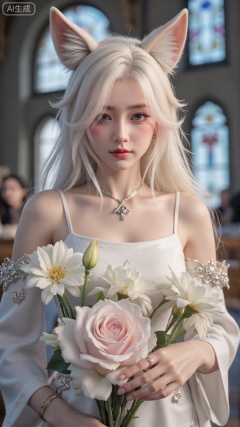 1girl, flower, solo, hair ornament, dress, bouquet, stained glass, hair flower, holding bouquet, white dress, holding, looking at viewer, necklace, jewelry, church, white flower, virtual youtuber, lily (flower), earrings, closed mouth, bare shoulders, indoors, off-shoulder dress, aqua eyes, long hair, off shoulder, wedding dress, light smile, mole, blue eyes, upper body, collarbone, holding flower,