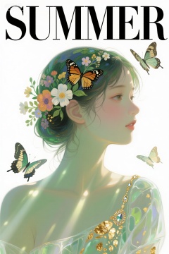 时尚杂志封面,岩石色板画,岩石色绘画,美丽的年轻女孩的头部装饰着鲜花和蝴蝶飞舞,可爱,上半身,白色背景,丁达尔光效应,绿色调插图奇幻并让人想起一个迷人的夏日场景。散发宁静,新笔触,透明和半透明风格,金箔,镶嵌装饰,克林姆特风格,标题文字“SUMMER”位于图像顶部,艺术字体,空灵,印刷插图。