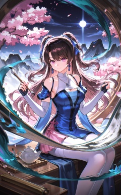 masterpiece,absurdres,best quality,high quality,chromatic_aberration,night,darkness,black theme,photorealistic,high contrast,high saturation//,1girl, sitting, long hair, solo, jewelry, cherry blossoms, mountain, dress, paintbrush, earrings, holding brush, holding, petals, blue dress, brown hair, teapot, smile, necklace, thighhighs, falling petals, teacup, gloves, bare shoulders, closed mouth, holding paintbrush, breasts, tree, cup, detached sleeves, twintails, fingerless gloves, clothing cutout, painting (action), white thighhighs, two side up, black hair, feet out of frame, white pantyhose, scroll, purple eyes, elbow gloves, calligraphy brush, chinese clothes, pantyhose, branch, sky, fish, water, bag, medium breasts, pink eyes <lora:Alicia 203.1up1344-000032:0.8>