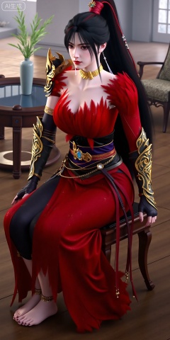 This is ZhaoXiangEr,  This is a highly detailed digital artwork of a female character with pale skin and long black hair tied in a high ponytail. She is wearing an elaborate red dress with gold accents and feather-like textures around the neckline and shoulders. Her armor includes gold and black gauntlets with intricate designs and a black and gold belt with a blue gem at the center. She has a gold choker necklace and long, dangling earrings,giving her a regal and confident expression. making the character the **** focus of the image. The style is realistic with a fantasy theme.