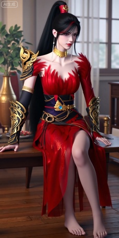 This is ZhaoXiangEr, This is a highly detailed digital artwork of a female character with pale skin and long black hair tied in a high ponytail. She is wearing an elaborate red dress with gold accents and feather-like textures around the neckline and shoulders. Her armor includes gold and black gauntlets with intricate designs and a black and gold belt with a blue gem at the center. She has a gold choker necklace and long, dangling earrings,giving her a regal and confident expression. making the character the **** focus of the image. The style is realistic with a fantasy theme.