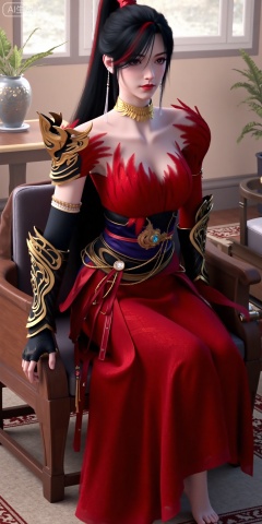 This is ZhaoXiangEr, This is a highly detailed digital artwork of a female character with pale skin and long black hair tied in a high ponytail. She is wearing an elaborate red dress with gold accents and feather-like textures around the neckline and shoulders. Her armor includes gold and black gauntlets with intricate designs and a black and gold belt with a blue gem at the center. She has a gold choker necklace and long, dangling earrings,giving her a regal and confident expression. making the character the **** focus of the image. The style is realistic with a fantasy theme.