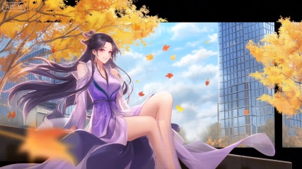 第一类裸眼3D画面,场景画面左侧展现一个穿着紫色连衣裙的女人,她的环境在秋风落叶下,有黄色的树、有蓝色天空、白云。她的长发随风飘扬,眼睛睁着,微笑。女人侧坐着右侧腿放松。精致的肌肤,正面照明,均匀光线,女人直视观众。背景为坚固的高楼和白色天空,有很多紧闭的玻璃窗户。场景是在背景下设置的。
