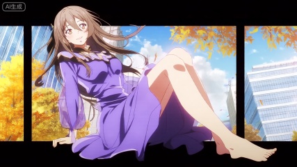 第一类裸眼3D画面,场景画面左侧展现一个穿着紫色连衣裙的女人,她的环境在秋风落叶下,有黄色的树、有蓝色天空、白云。她的长发随风飘扬,眼睛睁着,微笑。女人侧坐着右侧腿放松。精致的肌肤,正面照明,均匀光线,女人直视观众。背景为坚固的高楼和白色天空,有很多紧闭的玻璃窗户。场景是在背景下设置的。