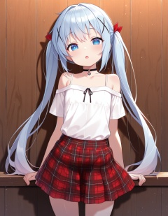 masterpiece,best quality,amazing quality,,xiangfengzhinai,1girl,bare shoulders,choker,collarbone,flat chest,highres,looking at viewer,open mouth,plaid clothes,plaid skirt,short sleeves,solo,standing,twintails,very long hair,<lora:kafuu_chino50xllokr:1>