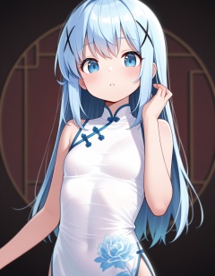 masterpiece,best quality,amazing quality,,xiangfengzhinai,1girl,solo,looking at viewer,long hair,blue hair,cheongsam,upper body,standing<lora:kafuu_chino50xllokr:1>