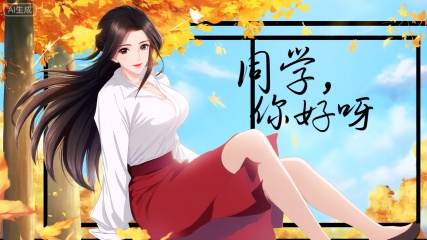 裸眼3D画面,动画风,画面左侧是一位绝美女性的形象,她身穿白色衬衫、红色裙子;所处环境为秋风落叶的场景,周边有黄色树木、蓝色天空与白云;该女性的长发随风飘扬,眼睛睁开、面带微笑且直视观众;以侧坐姿态呈现,右侧腿部放松;拥有精致的肌肤,采用正面照明方式,光线均匀,女人直视观众;画面右上侧用符合整体风格的字体显示‘同学,你好呀’;场景外设有玻璃墙。