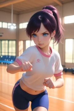 1girl, solo, athletic wear, high ponytail, minimal accessories, gym setting, focused lighting, active pose, determined expression, clean fitness background, masterpiece, best quality