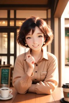 1girl, solo, casual outfit, short messy hair, simple earrings, coffee shop setting, natural lighting, relaxed pose, warm smile, cozy interior background, masterpiece, best quality
