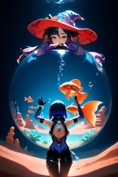 2girls, yelan \(genshin impact\), mona \(genshin impact\), underwater, blue wire, bubble, desert, orange fish, spotlight, dark, low-angle view, cowboy shot, hug, hat, masterpiece, best quality