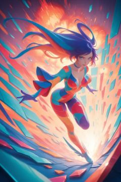 1girl, solo, abstract background, explosion of colors, distorted perspective, cubism art style, dynamic pose, colorful shards, fragmented shapes, masterpiece, best quality