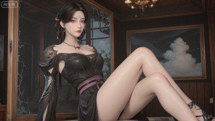 1girl,jewelry,earrings,necklace,black dress, side_sitting, legs, Glasses-Free 3D, class 1 Glasses-Free 3D,120 degree angled glass screen, looking at viewer, exquisite_skin, even illumination, very awa, Solid Glossy and cloud background,