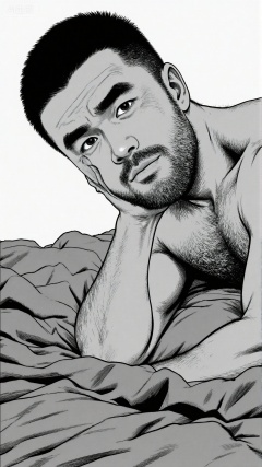 comic,The image depicts a man lying on a bed,partially covered by a blanket. He has short, dark hair and a neatly trimmed beard. His expression appears contemplative with his head resting on his left arm which is bent at the elbow. The man's body is partially visible showing a muscular build. The background is plain with no additional objects or details. The image is in black and white with fine lines used to create shading and texture.