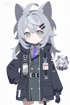 1girl,, solo,, long hair,, looking at viewer,, smile,, bangs,, simple background,, shirt,, hair ornament,, gloves,, long sleeves,, white background,, animal ears,, hair between eyes,, closed mouth,, jacket,, ahoge,, grey hair,, cowboy shot,, necktie,, hairclip,, chibi,, official alternate costume,, coat,, black jacket,, hand on hip,, grey eyes,, scar,, wolf ears,, Negative prompt: ng_deepnegative_v1_75t,(badhandv4:1.2),EasyNegative,(worst quality:2),serrated black border,username,out of focus,bad proportions,cropped,watermark,signature,worstquality,grayscale,logo,text,blurry,low quality,bad anatomy,sketches,lowres,normal quality,monochrome,simple.co,,nsfw, Steps: 44, Sampler: Euler a, CFG scale: 7.0, Seed: 1995394087, Size: 1024x1536, Model hash: fe1361c879, Model: illustrious_v20_1.safetensors, Denoising strength: 0.0, RNG: CPU, Lora 1: Art-维C, Lora Hash 1: ffd1cb65f2, Lora Weight 1: 0.8, vae_name: automatic