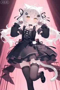 cyan color, black theme,1girl, ahoge, animal ear fluff, animal ears, black dress, black footwear, black ribbon, black thighhighs, blush, cat ears, cat girl, cat tail, choker, detached sleeves, dress, fishnet gloves, fishnets, gloves, grey hair, hair ornament, hair ribbon, long hair, ribbon, tail, thighhighs, twintails, virtual youtuber, white hair, yellow eyes