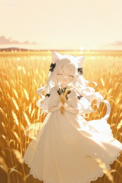 cyan color, yellow theme,from above, 1girl, loli, (solo), catgirl, cat ears, white hair, cat tail, closed eyes, (smile), open mouth, skirt, white dress, white capelet, long hair, wavy hair, fluffy hair, bow, black bow, blush, capelet, lace trim, sunset, long dress, dusk, scenery, gold sky, high place, horizon, wheat field, wheat ears, wind, wind blow, looking at viewer, (depth of field), bokeh, holding a wheat ears, holding, tail, outdoors, feet out of frame, animal ears, ^ ^
