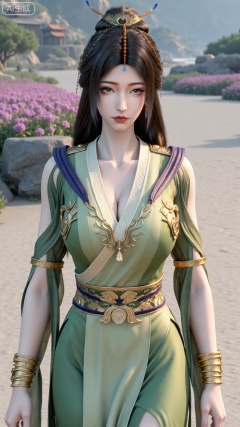 (masterpiece:1.2),best quality,absurdres,masterpiece,original,extremely detailed wallpaper,perfect lighting,(extremely detailed CG:1.2),1girl,solo,standing,looking at viewer,(cowboy_shot:1.1),long hair,high heels,blurry background,depth of field,motion blur,long dress,china_dress,chinese_style,bare shouders,crystal_earrings,headpiece,hair_tie,chest_jewel,gem,necklace,jewelry,in summer,day,outdoors,(nature,sea,flowers,beach:1.59),(huge breasts:2.99),(full breasts:2.99),XbaifengsongyuYH,Xbigbreasts,XmengkeerXHY,XliuyuH