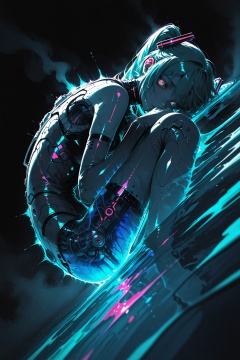 masterpiece,Hatsune Miku,limited palette,black background,colorful,vibrant,glowing outline,blacklight,looking at viewer,fog,from_side,Holding the lake water,the fluorescent lake water,mercury,dark,vibrant,looking at viewer,fog,from_above,transparent body,mechanical structures inside the body,complex mechanical structures,cyberpunk,floating on the water,curled up,