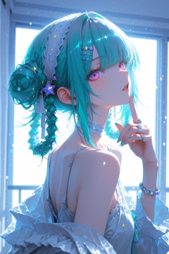 1girl,solo,long hair,looking at viewer,bangs,hair ornament,jewelry,purple eyes,braid,twintails,multicolored hair,choker,hairclip,pink eyes,off shoulder,star \(symbol\),nail polish,bracelet,aqua hair,ring,hair rings,star hair ornament,short hair,bangs,hair ornament,dress,bare shoulders,upper body,hairband,parted lips,looking back,hair bun,official alternate costume,backlighting,blue and white theme,depth of field,cinematic lighting,light particles,lens flare,(artist:quasarcake:0.8),extreme aesthetic,(wlop:0.6),masterpiece,best quality,good quality,newest,year 2024,year 2023,very aesthetic,absurdres,Visual impact,A shot with tension,ultra-high resolution,32K UHD,sharp focus,best-quality,masterpiece,Emotionalization,unconventional supreme masterpiece,masterful details,temperate atmosphere,with a high-end texture,in the style of fashion photography,(Visual impact:1.2),giving the poster a dynamic and visually striking appearance,impactful picture,offcial art,colorful,splash of color,movie perspective,masterpiece,best quality,amazing quality,very aesthetic,absurdres,best quality,newest,