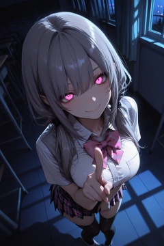 masterpiece,from_above,1girl,solo,large_breasts,gray_hair,long_hair,low_twintails,pink_eyes,school_uniform,checkered_skirt,black_thighhighs_socks,classroom,girl style smile,pointing at you,night,darkness,backlight,shadow,