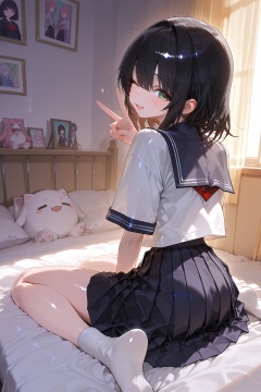 {observerz},modare,mikaze oto,[artist:kedama milk],[artist:ask_(askzy)],ciloranko,ponzu(catponz),year 2023,masterpiece,best quality,amazing quality,absurdres,newest,1girl,school_uniform,shiny_skin,bedroom,solo,back to back,looking_back,wariza,wink,v,