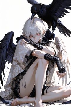 1boy,solo,animal,crow,sitting,feathers,white hair,barefoot,bird on arm,gloves,bird,albino,fingerless gloves,animal on arm,black gloves,wing,simple background,angel wings,looking at viewer,feathered wings,white background,masterpiece,best quality,