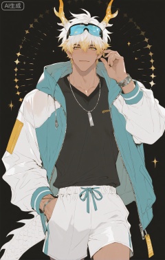 ,xiao zhi tiao,(artist:mazjojo:0.77), (artist:pigeon666:0.70), (artist:zawar379:0.83), (artist:remsrar:0.65), (artist:chimmyming:0.72),masterpiece,best quality,male focus,hd,4kamazing quality,very aesthetic,bust,high resolution,ultra-detailed,perfect lighting,volumetric lighting,,xiaozhitiao,yu xuan,multicolored hair,White dragon tail,White dragon horns,sneakers,white shorts,headphones,tattoo,yellow eyes,white hair,1boy,blonde hair,bangs,white **** top,