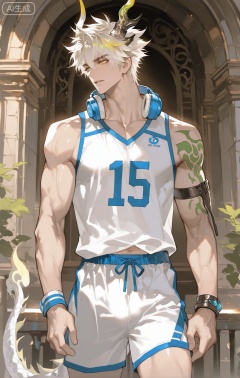 ,xiao zhi tiao,(artist:mazjojo:0.77), (artist:pigeon666:0.70), (artist:zawar379:0.83), (artist:remsrar:0.65), (artist:chimmyming:0.72),masterpiece,best quality,male focus,hd,4kamazing quality,very aesthetic,bust,high resolution,ultra-detailed,perfect lighting,volumetric lighting,,xiaozhitiao,yu xuan,multicolored hair,White dragon tail,White dragon horns,sneakers,white shorts,headphones,tattoo,yellow eyes,white hair,1boy,blonde hair,bangs,white **** top,