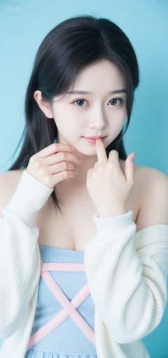 An Asian female star,large natural breast,8K resolution,professional grade photography,shooting a cute girl,perfect upper body,delicate and detailed facial features,she has bright and expressive brown eyes,natural and fresh eye makeup,soft and smooth eyebrows that complement her overall temperament,small and slightly upturned nose,pink lips,showing a gentle and sweet expression,natural and realistic facial pore structure,jet black shoulder-length hair neatly smooth,hair strands show natural luster and transparency,she is wearing a light blue strapless dress,with a pink cross-strap design on the chest,wearing a white knitted cardigan,the texture of the material is clearly visible,the posture is cute,hands with index finger and thumb gently touching the cheeks,as if to be cute,background is pure light blue,the light is even and soft,accurately lit from an appropriate angle,creating a fresh and sweet lighting atmosphere,the colors in the picture are vivid and natural,high sharpness,low noise,depth of field highlights the subject,details are rich,showing extremely high quality and realism,conveying a playful and cute emotional atmosphere.,, Negative prompt: ng_deepnegative_v1_75t,(badhandv4:1.2),EasyNegative,(worst quality:2),,nsfw, Steps: 20, Sampler: Euler, CFG scale: 3.5, Seed: 2401067185, Size: 720x1536, Model hash: 49fe535dad, Model: 星梦·电影&电视剧_Film_fp8.safetensors, Denoising strength: 0, RNG: CPU, Lora 1: F.1极致摄影-清颜冷杉, Lora Hash 1: 0214f6755f, Lora Weight 1: 0.8, vae_name: automatic