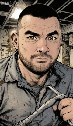 In a realistic comic style,depict a middle - aged man with a crew cut and stubble on his face. His eyes are deep - set. He is wearing work clothes,tightly holding tools in his hands,standing in a factory workshop full of oil stains,with a very focused expression.,