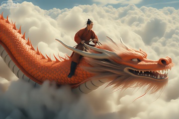The image depicts a person riding a majestic dragon through a sky filled with clouds. The dragon is vibrant with orange and yellow scales, and its eyes are fierce, with sharp teeth visible. The rider is dressed in traditional attire, wearing a red robe and holding the reins tightly. The background consists of a vast expanse of fluffy white clouds, giving a sense of elevation and freedom. The overall scene is fantastical and reminiscent of mythological or historical depictions.