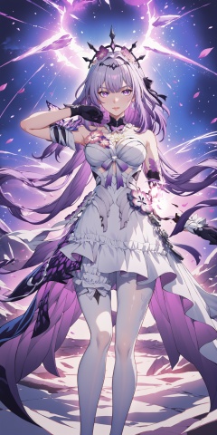(illustration:1.1),.,.,general,.,.,1girl,<lora:Castorice-noob-Tanger:0.7>,Castorice \(honkai: star rail\),clothes: Castorice  def  white dress,black tiara,purple eyes,purple hair,bangs,black gloves,white pantyhose,, very awa, masterpiece, best quality, highres, absurdres,