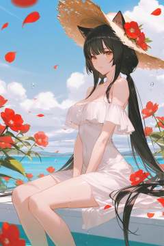 artist:ask_(askzy),artist:yolanda,[artist:WANKE],artist:ciloranko BREAK Simple Flat Coloring,shiny skin,very aesthetic,high definition,masterpiece,illustration,best quality, -cat girl, 1girl, solo, dress, long hair, hat, white dress, sky, outdoors, day, looking at viewer, sitting, cloud, petals, bare shoulders, flower, medium breasts, breasts, twintails, blue sky, water, bangs, straw hat, black hair, off shoulder, water drop, brown eyes, between legs, low twintails, blush, parted lips, red flower, sidelocks, hand between legs, off-shoulder dress, bare legs, cloudy sky, closed mouth, very long hair
