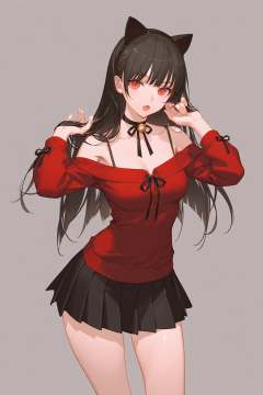 artist:ask_(askzy),artist:yolanda,[artist:WANKE],artist:ciloranko BREAK Simple Flat Coloring,shiny skin,very aesthetic,high definition,masterpiece,illustration,best quality, -1girl, solo, long hair, animal ears, open mouth, red eyes, black hair, ribbon choker, skirt, black skirt, off shoulder, looking at viewer, choker, cat ears, long sleeves, bare shoulders, red shirt, shirt, simple background, bra strap, miniskirt, cowboy shot, fake animal ears, black choker, ribbon, breasts, collarbone, off-shoulder shirt, bangs, black ribbon, medium breasts, neck ribbon, standing, :o, fang, red sweater, bra, hairband, pleated skirt, bell, underwear, grey background