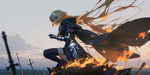 oil painting,impasto,highres,extremely detailed 8k wallpaper,illustration,depth of field,great quality,masterpiece,best quality,amazing quality,very aesthetic,absurdres,wallpaper,detail eyes,artist:dino_(dinoartforame),artist:konya_karasue,(artist:nixeu:0.8),(artist:wlop:0.5),artist:ciloranko BREAK<lora:Dark fantasy style:0.7>, -Dark fantasy style, 1girl, solo, blonde hair, long hair, jeanne d'arc (fate), thighhighs, jeanne d'arc (ruler) (fate), armor, headpiece, gauntlets, outdoors, cape, very long hair, from side, fire, sky, black thighhighs, chain, armored dress, profile