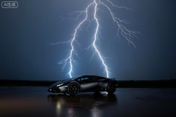 A car driving on a ground, framed with thunder and lightning in the background. The sky is overcast with dark clouds, lightning strikes illuminating the scene. The car's headlights add contrast against the stormy backdrop.,兰博基尼,Thunder and lightning,masterpiece